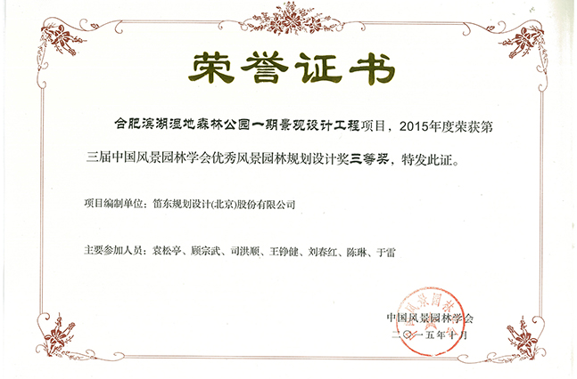 合肥濱湖濕地森林公園一期景觀設(shè)計(jì)工程榮獲2015第三屆優(yōu)秀風(fēng)景園林規(guī)劃設(shè)計(jì)獎(jiǎng)三等獎(jiǎng)