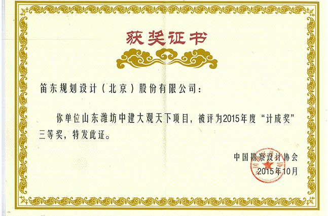 山東濰坊中建大觀天下榮獲中國(guó)勘察設(shè)計(jì)協(xié)會(huì)2015年度計(jì)成獎(jiǎng)三等獎(jiǎng)