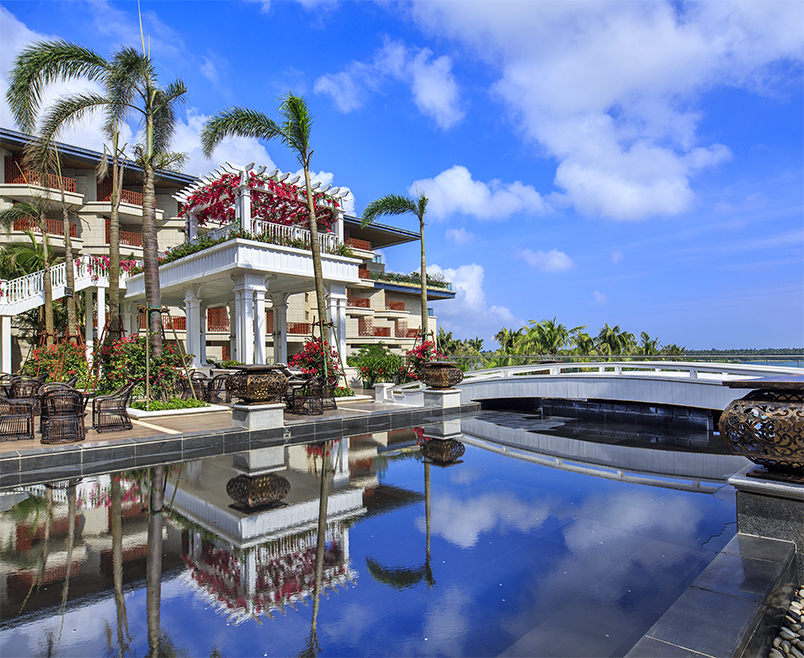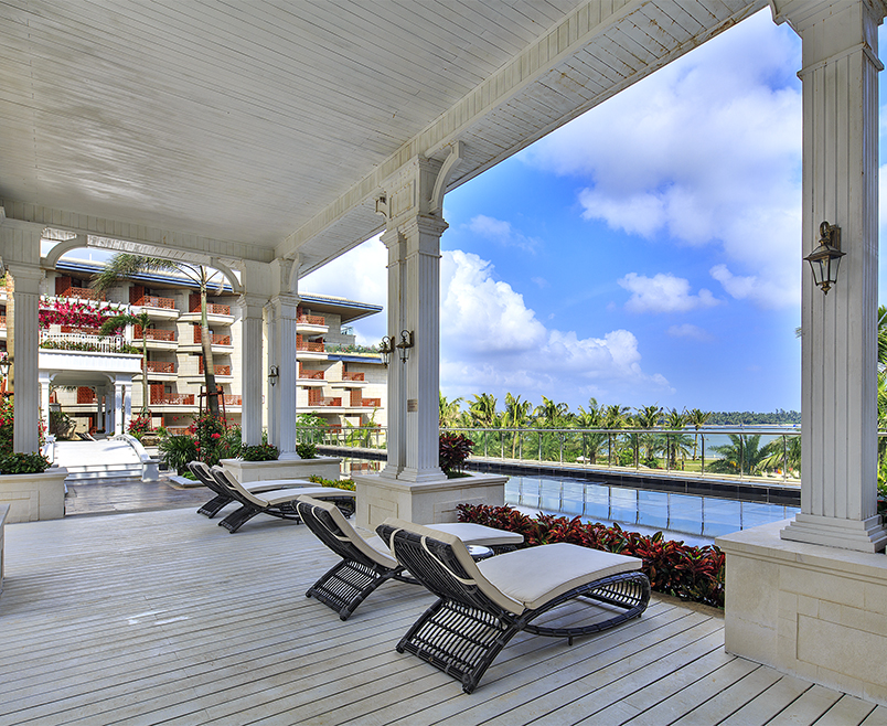 項目位于海南省文昌市清瀾半島,背靠沙灘海浪。因限于地勢平坦,很難遠眺將盛景盡收眼底,設(shè)計團隊在距地面近7m高的酒店平臺,打造了“空中花園”。