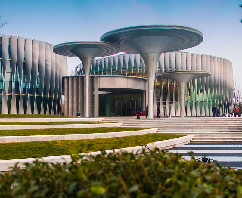 笛東在景觀設(shè)計(jì)上延續(xù)建筑體塊疊加與同心圓兩大元素,在前廣場(chǎng)采用長(zhǎng)條型序列鋪裝,交錯(cuò)于建筑本身的圓形語(yǔ)言以及所引發(fā)的同心圓鋪裝,形成一種對(duì)立統(tǒng)一的關(guān)系。在具備引導(dǎo)功能的同時(shí),展現(xiàn)豐富的場(chǎng)地豎向關(guān)系。場(chǎng)地與入口道路連接處設(shè)有一疊水景觀,豐富空間構(gòu)成。