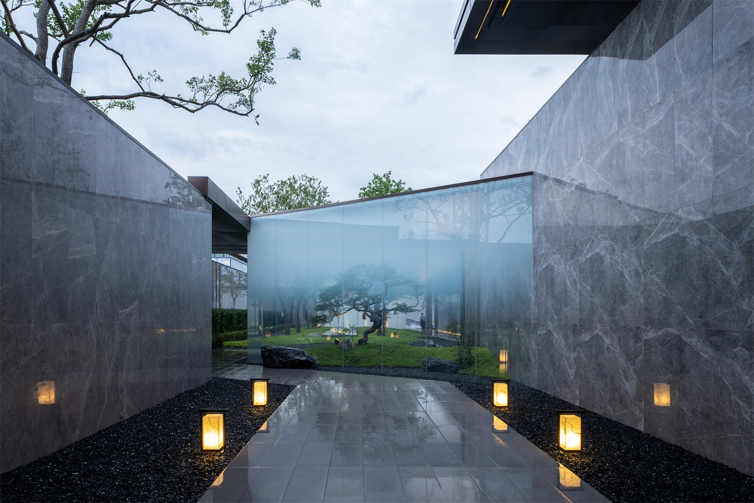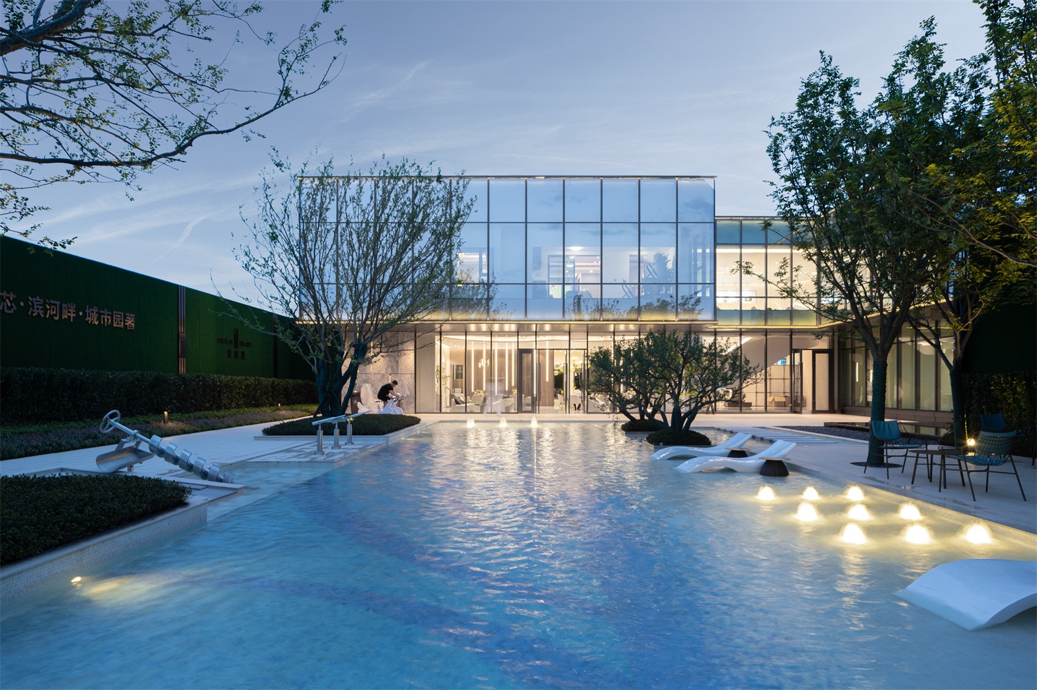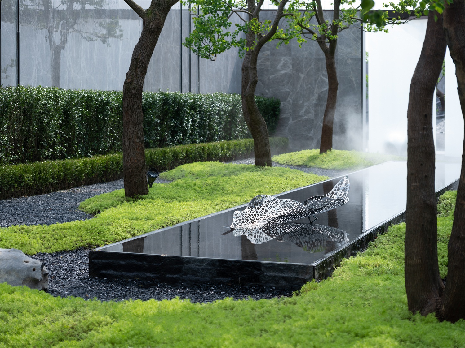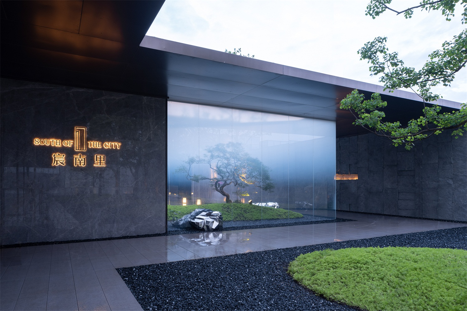 中國金茂·宸南里著眼于客戶的參觀體驗,從尊貴的入口門樓引導(dǎo)人們進(jìn)入一個林溪自然的互動性景觀中;軒昂門宇、穿越森林,觀賞瀑布,互動參與層層遞進(jìn),讓人們置身景觀之中,感受自然式的都市生活。我們尊重場地特質(zhì)和在地性,用人工手法模擬自然,將位于場地西側(cè)的雄溪河濕地景觀引入場地當(dāng)中,將生活與自然相互交織,營造城市里的自然意境院落,創(chuàng)造沉浸式的自然景觀體驗。