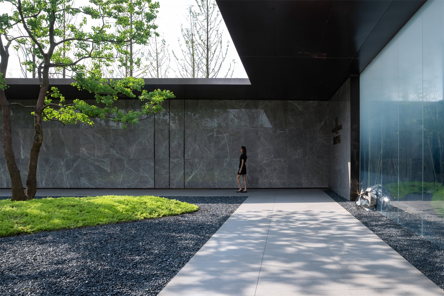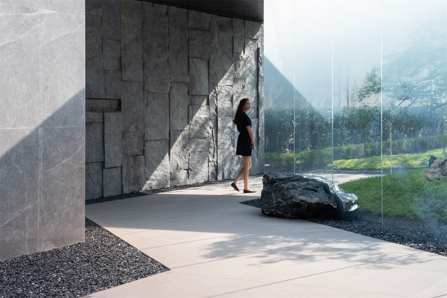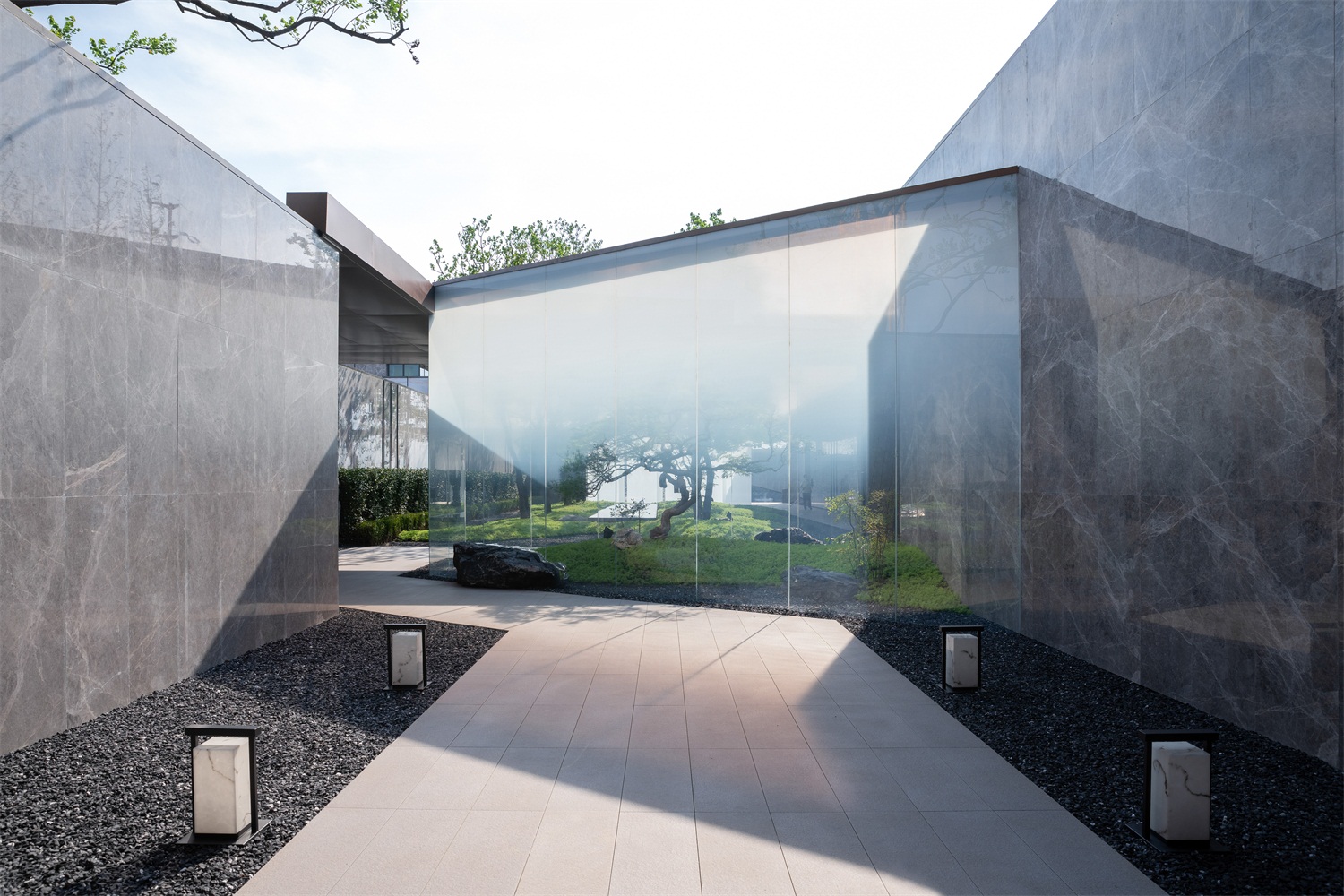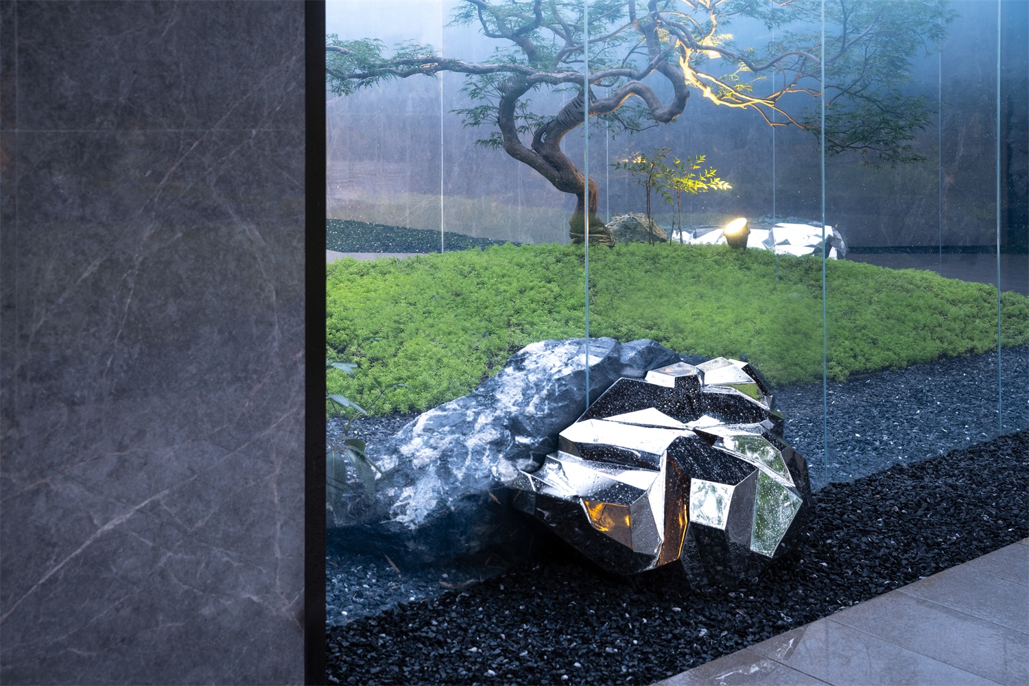 中國金茂·宸南里著眼于客戶的參觀體驗,從尊貴的入口門樓引導(dǎo)人們進(jìn)入一個林溪自然的互動性景觀中;軒昂門宇、穿越森林,觀賞瀑布,互動參與層層遞進(jìn),讓人們置身景觀之中,感受自然式的都市生活。我們尊重場地特質(zhì)和在地性,用人工手法模擬自然,將位于場地西側(cè)的雄溪河濕地景觀引入場地當(dāng)中,將生活與自然相互交織,營造城市里的自然意境院落,創(chuàng)造沉浸式的自然景觀體驗。
