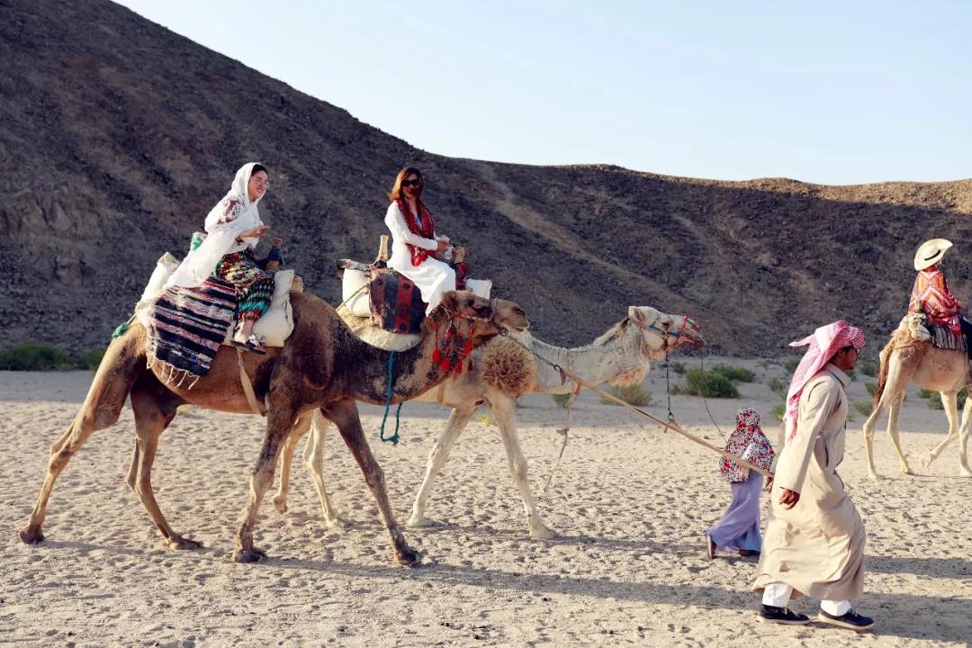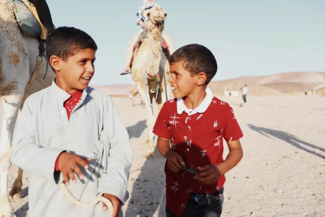 騎著駱駝欣賞沙漠是件非常愜意的事,會(huì)頻頻引來(lái)眾人歆羨的目光。牽駱駝的小孩子們自顧自的交流,更加映襯出這片土地的靜謐和魅力。