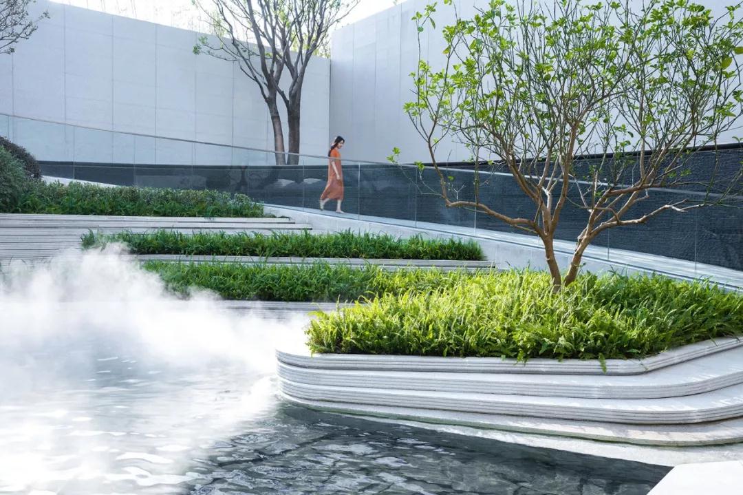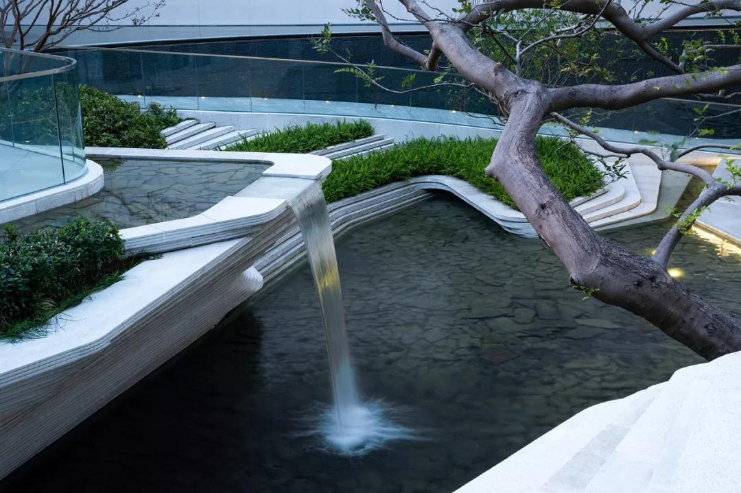 太倉(cāng)坐落于江蘇省蘇南區(qū)域,是一個(gè)歷史悠久的江南小城。明代著名航海家鄭和正是從太倉(cāng)出發(fā),向西進(jìn)行了7次偉大的航海之旅。翡麗云邸項(xiàng)目的業(yè)主期待這個(gè)社區(qū)中心采用現(xiàn)代語(yǔ)匯設(shè)計(jì),并反映出當(dāng)?shù)匚幕莫?dú)特特征。設(shè)計(jì)師將有機(jī)現(xiàn)代主義的風(fēng)格引入,與場(chǎng)地現(xiàn)狀的垂直空間條件結(jié)合,在垂直變化和流線設(shè)計(jì)的動(dòng)態(tài)過(guò)程中,精心布置了多達(dá)6種水景形式,最終形成風(fēng)、光、瀑音、樹影于一體的美妙的庭院景觀。