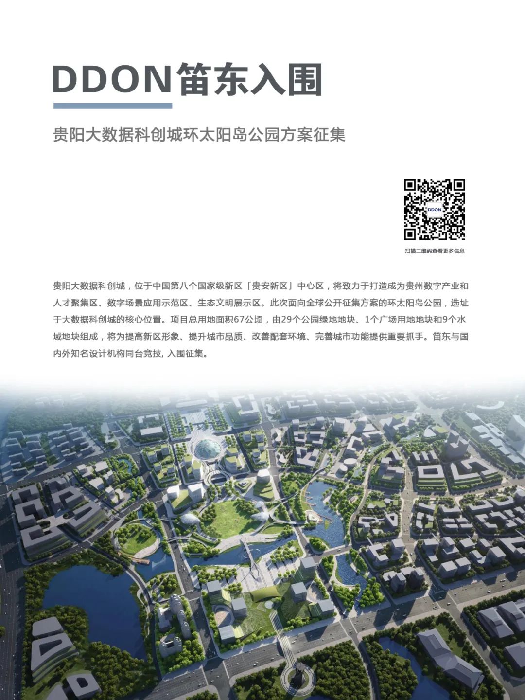貴陽(yáng)大數(shù)據(jù)科創(chuàng)城,位于中國(guó)第八個(gè)國(guó)家級(jí)新區(qū)「貴安新區(qū)」中心區(qū),致力于打造成為貴州數(shù)字產(chǎn)業(yè)和人才聚集區(qū)、數(shù)字場(chǎng)景應(yīng)用示范區(qū)、生態(tài)文明展示區(qū)。此次面向全球公開征集方案的環(huán)太陽(yáng)島公園,選址于大數(shù)據(jù)科創(chuàng)城的核心位置。項(xiàng)目總用地面積67公頃,將為提高新區(qū)形象、提升城市品質(zhì)、改善配套環(huán)境、完善城市功能提供重要抓手。DDON笛東與國(guó)內(nèi)外知名設(shè)計(jì)機(jī)構(gòu)同臺(tái)競(jìng)技,入圍征集。