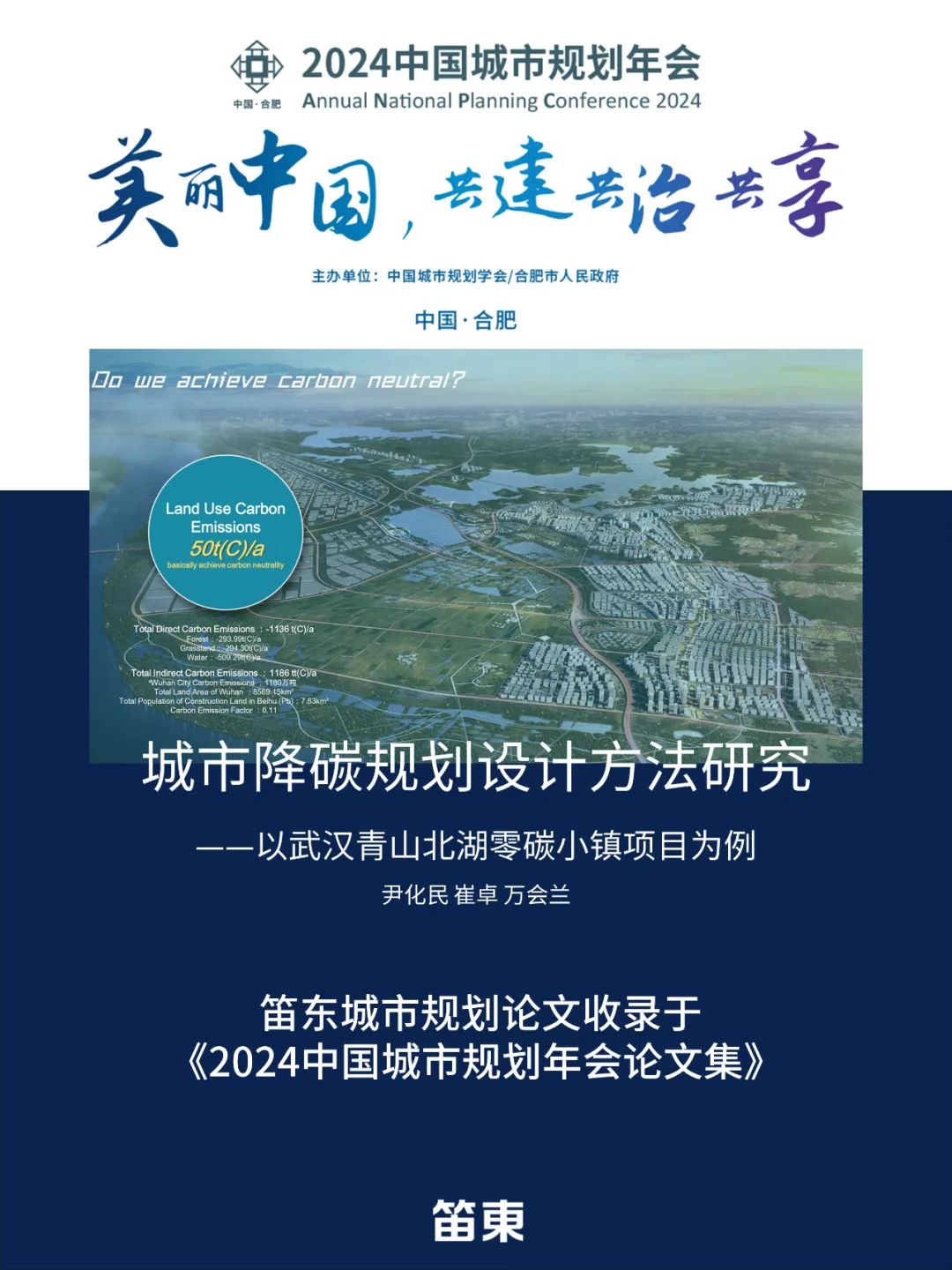 本屆年會論文征集得到851家單位的11000多位作者積極支持和踴躍參與。笛東團隊尹化民、崔卓、萬會蘭撰寫的《城市降碳規(guī)劃設(shè)計方法研究——以武漢青山北湖零碳小鎮(zhèn)項目為例》收錄于《2024中國城市規(guī)劃年會論文集》城市規(guī)劃新技術(shù)應(yīng)用主題,并將以墻報等形式于年會現(xiàn)場展示。