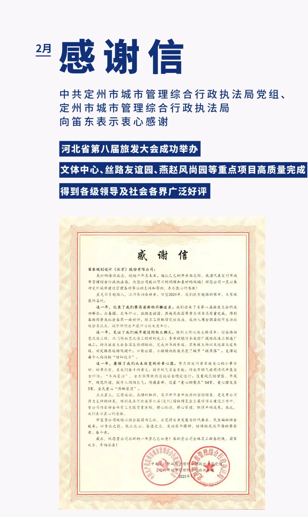 中共定州市城市管理綜合行政執(zhí)法局黨組、定州市城市管理綜合行政執(zhí)法局向笛東再次發(fā)來感謝信,對笛東在定州城市建設管理,特別是第八屆河北省旅游產業(yè)發(fā)展大會定州分會場展園建設相關工作中的克服困難,精心組織,精心管理表示衷心感謝。